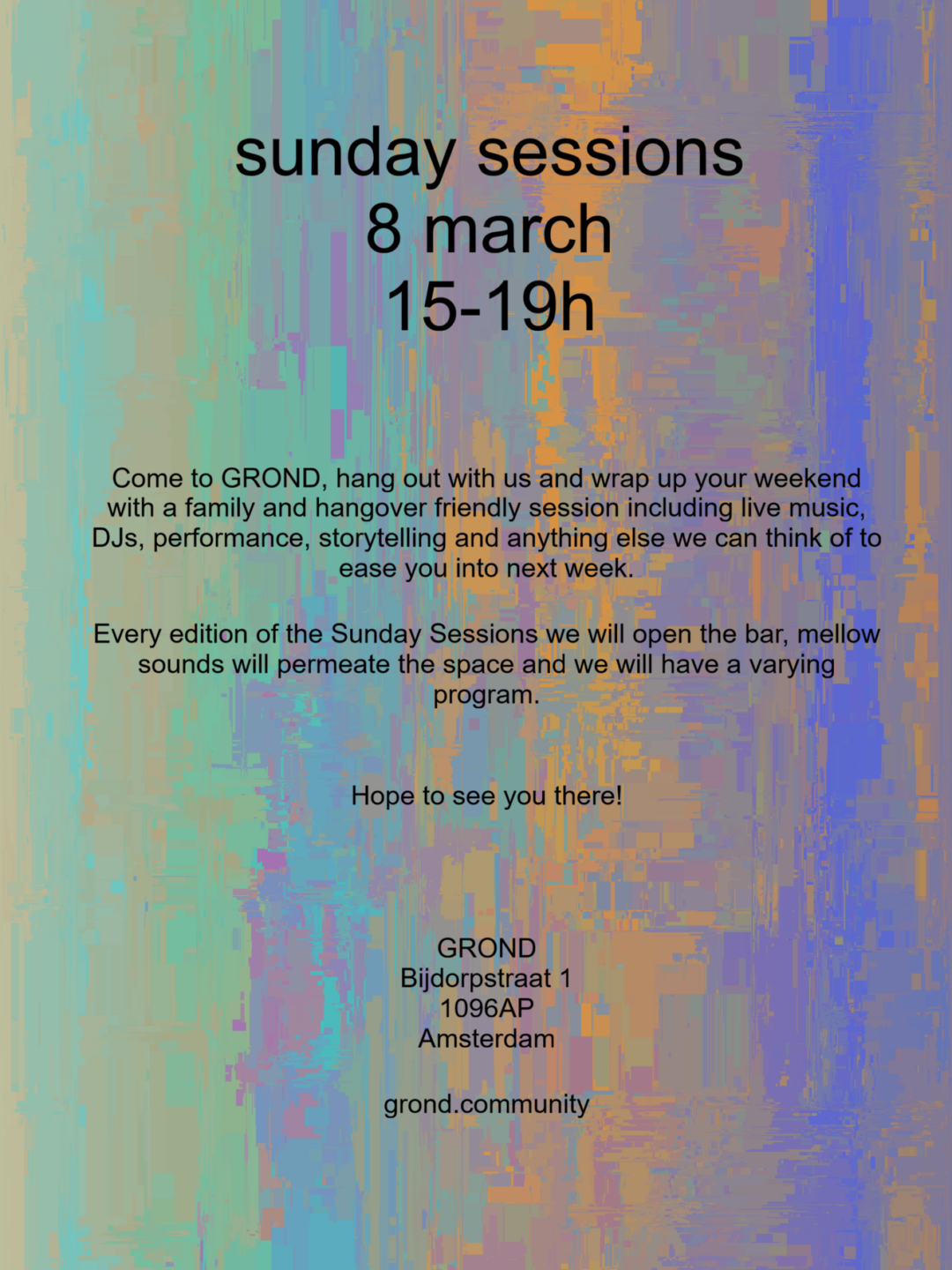 Come to GROND, hang out with us and wrap up your weekend with a family and hangover friendly session including live music, DJs, performance, storytelling and anything else we can think of to ease you into next week. Every edition of the Sunday Sessions we open the bar, mellow sounds will permeate the space and each time we will have a varying program.